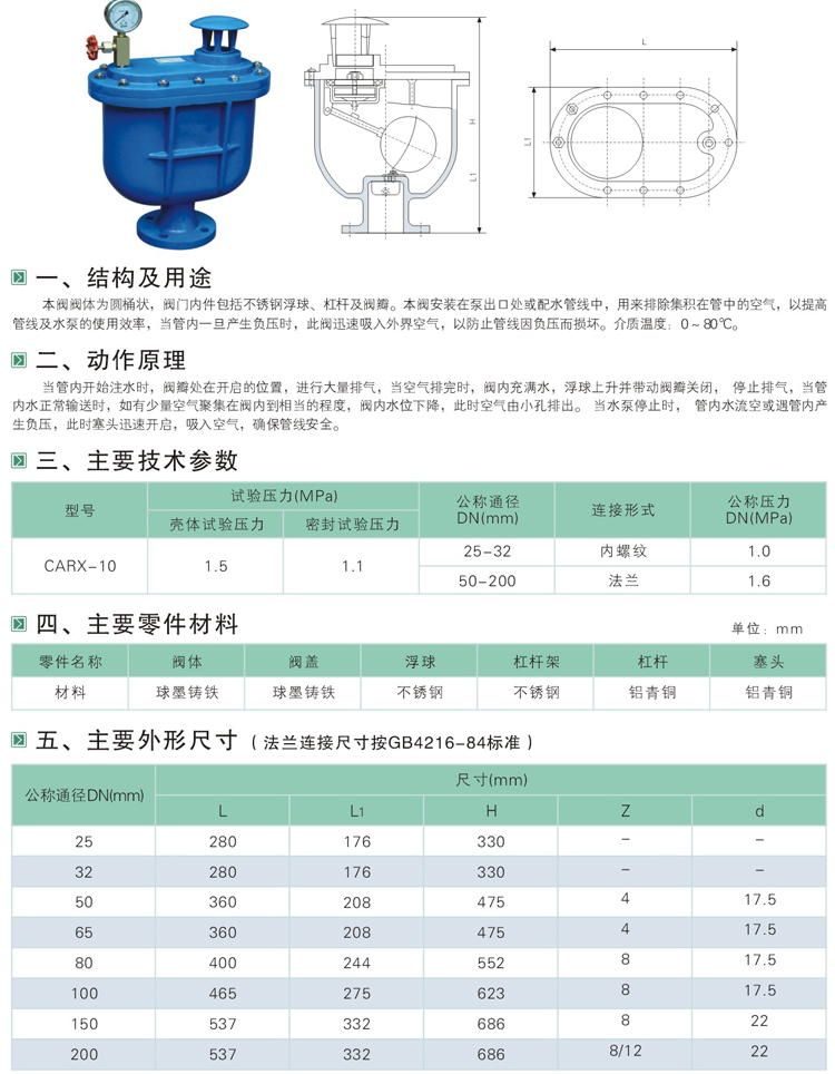 CARX復(fù)合式排氣閥閥體為圓桶狀,閥門內(nèi)件包括不銹鋼球、閥桿及閥瓣。本閥安裝在泵出口處或送配水管線中,用來排除集積在管中的空氣,以提高管線及水泵的使用效率,當(dāng)管內(nèi)一旦產(chǎn)生負(fù)壓時(shí),此閥迅速吸入外界空氣,以防止管線因負(fù)壓而損壞。